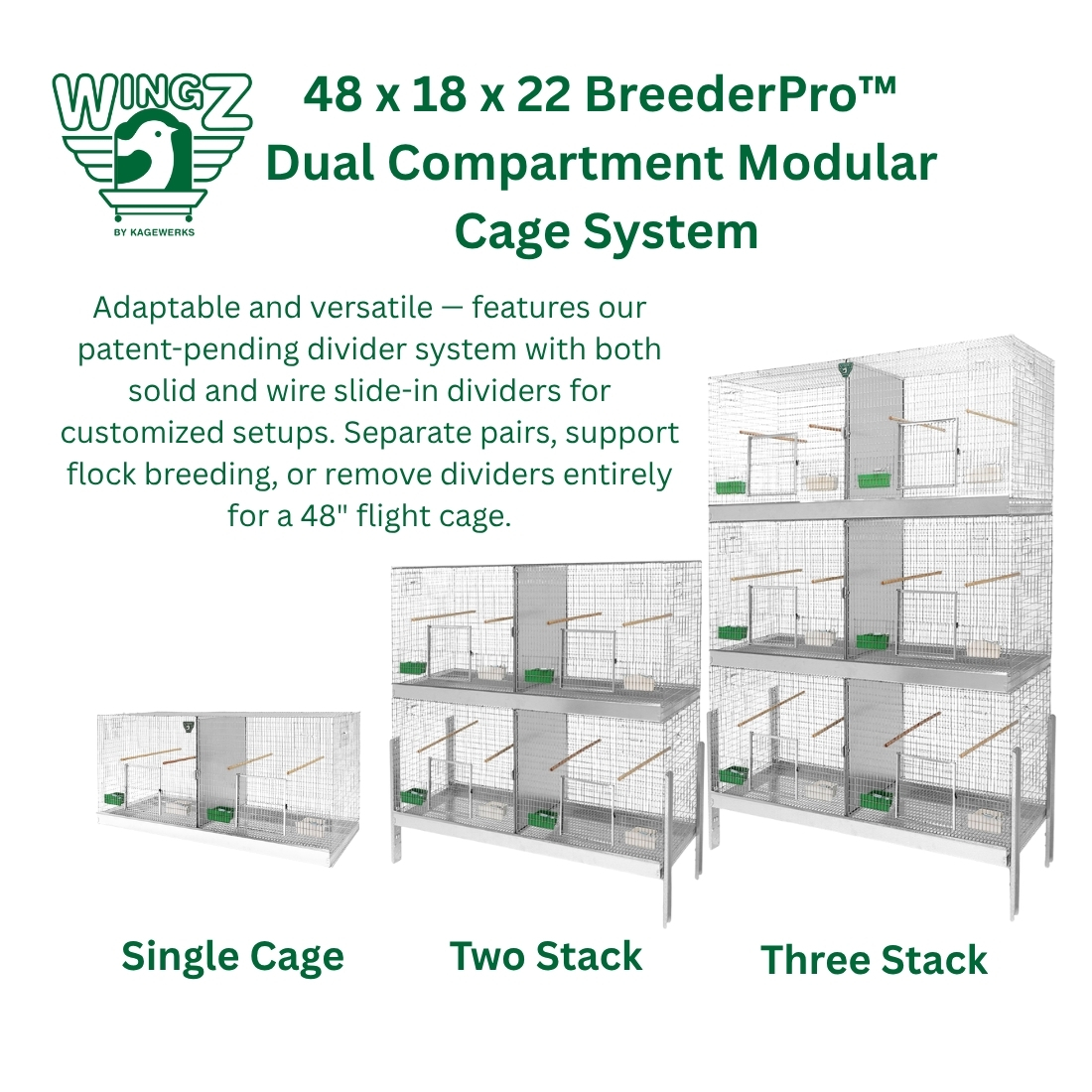The 48 x 18 x 22 BreederPro™ Cage offers unmatched versatility with its dual-compartment divider system. Includes both solid and wire dividers for flexible breeding setups—or remove them completely for a 48" flight cage.