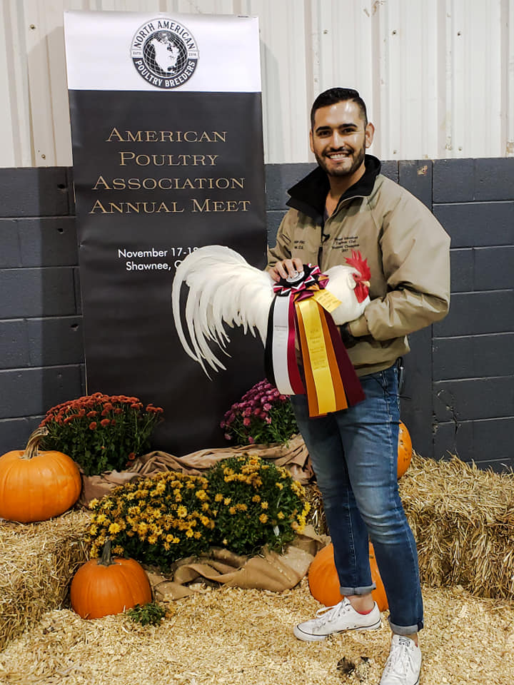 Pictured: Christian with his Single Comb White Leghorn cockerel that won Champion Large Fowl of the show at the APA National Show 2017.